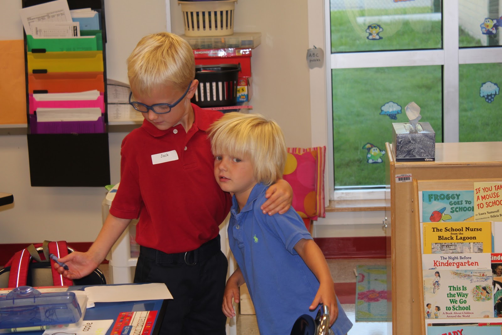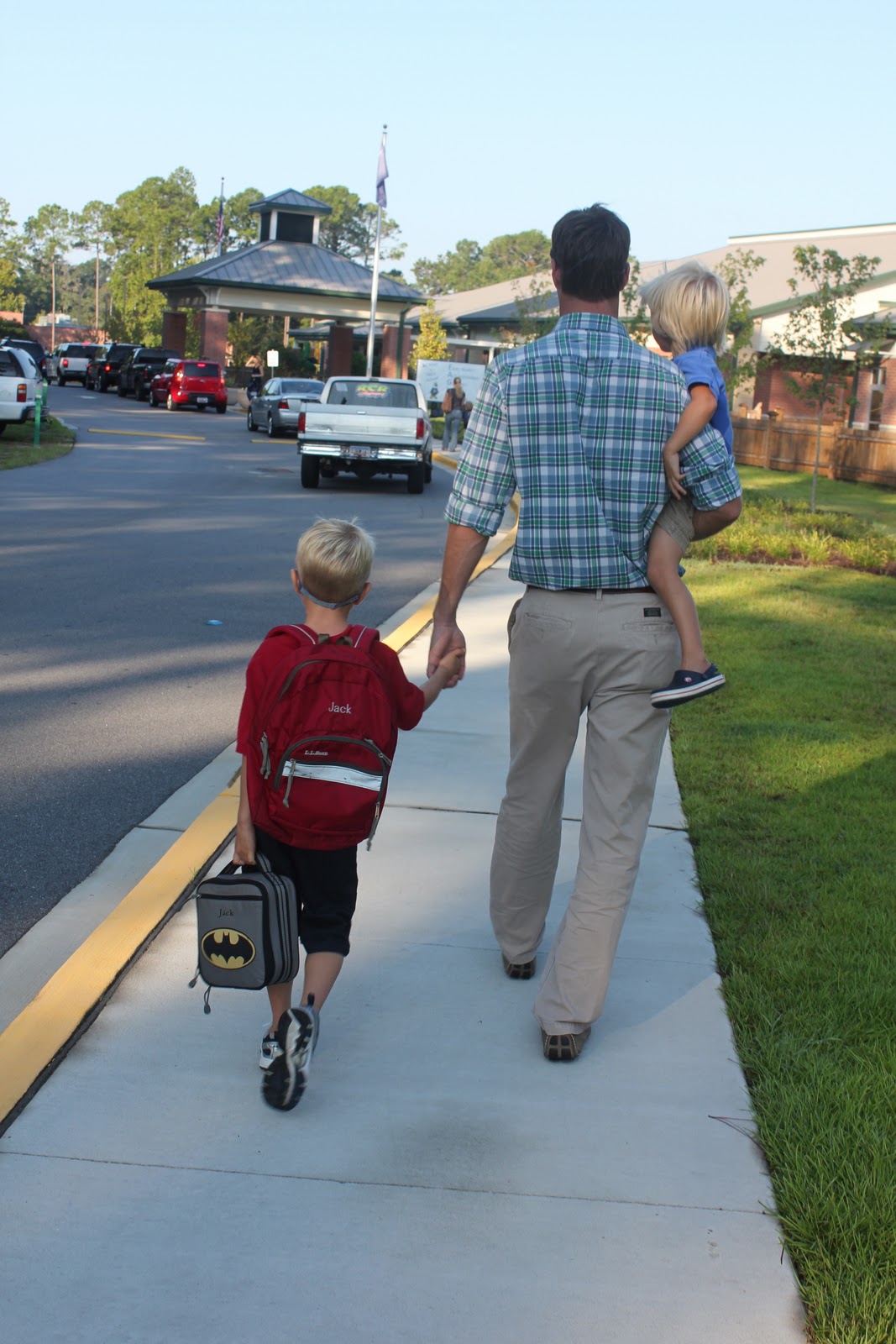We pulled into the school. All was well. Jack still wanted something to do with us. He even held John's hand.