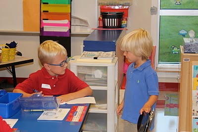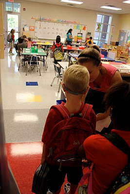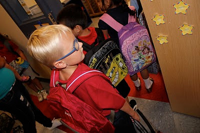 And then we came to the hallway of strangers....most likely ill intentioned youngsters waiting to ruin my perfect little boy with their glue eating ways.